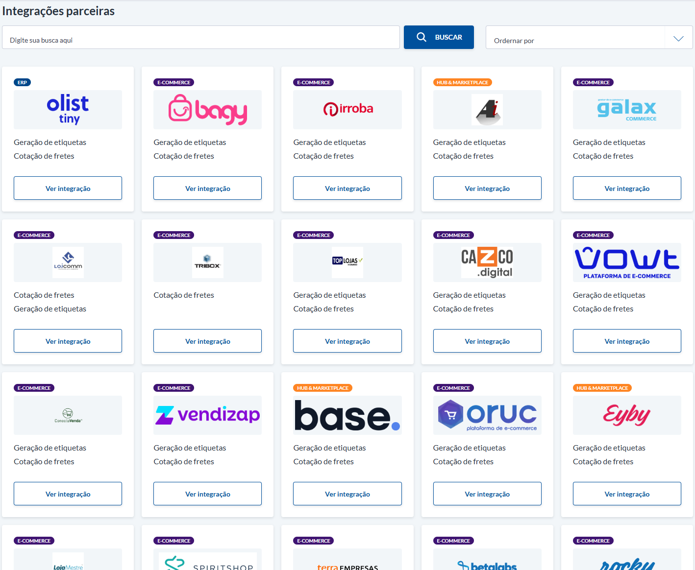 Você pode conferir todas as integrações homologadas no catálogo de seu painel dentro do Melhor Envio: